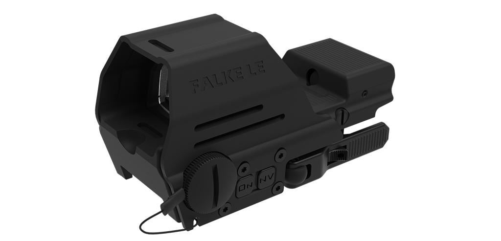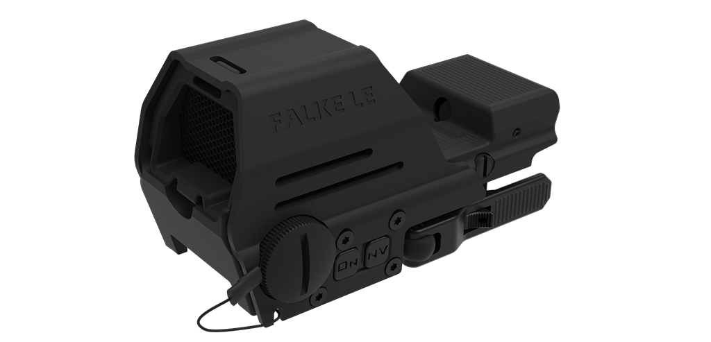 Запатентованная антибликовая сотовая бленда может быть надёжно установлена и удалена в течение нескольких секунд. Falke LE поставляется со встроенным креплением QD Picatinny.