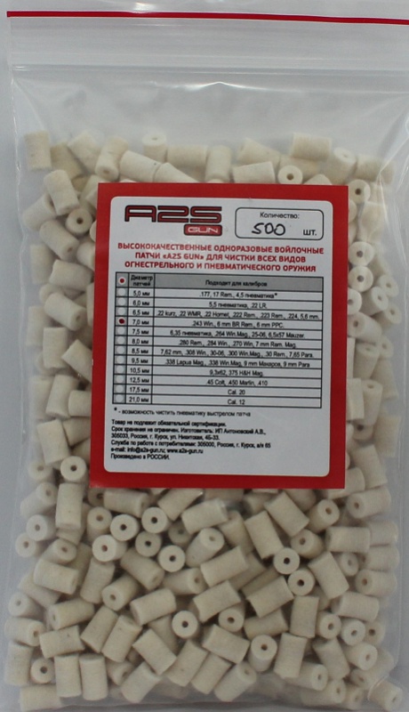 Купить «Войлочные патчи A2S GUN, 6,35 пневматика, .264Win Mag., 25-06, диаметр 7,5 мм, уп. 500 шт. (A2S-7.5-500)» легко — просто позвоните по телефону